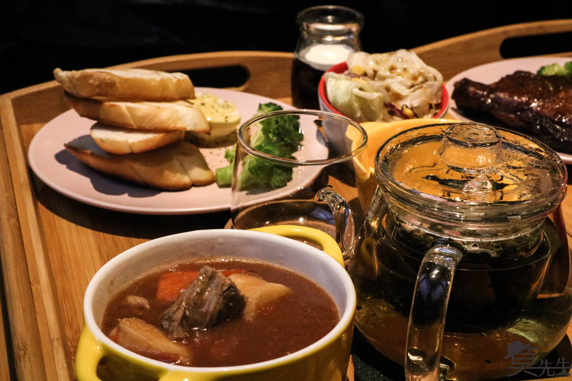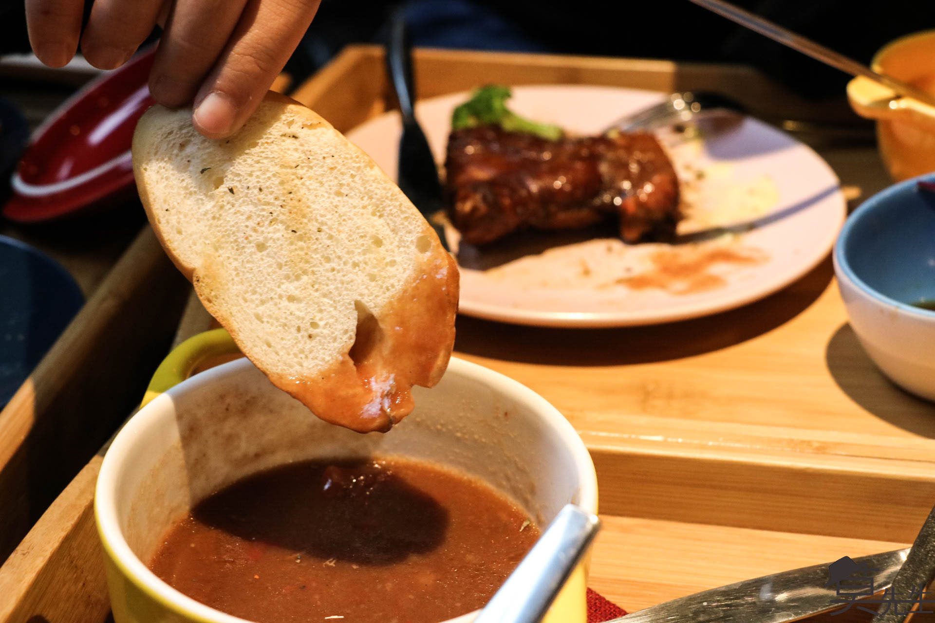 套餐的主餐可以選擇白飯或是麵包。如果是點燉牛肉,蠻建議選擇麵包,學習歐式吃法:用麵包去唰牛肉的醬料,讓麵包吸飽醬汁,口感更加濃郁!