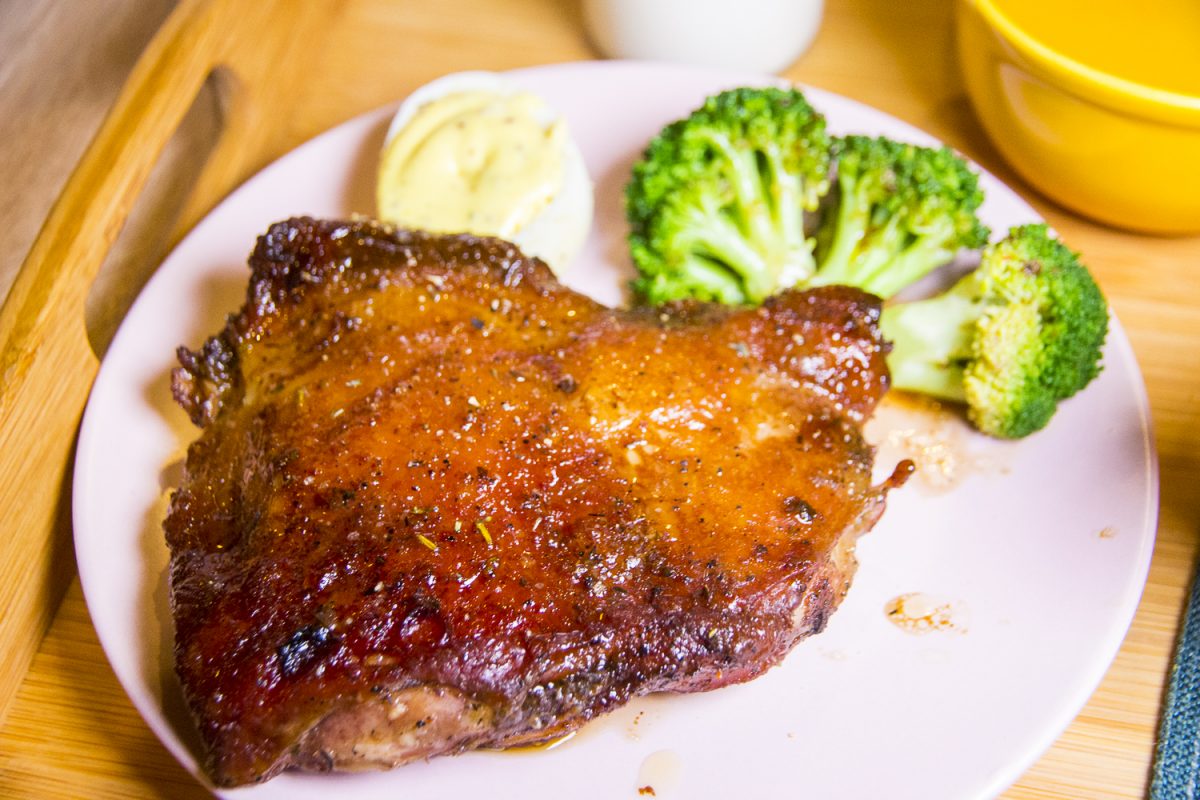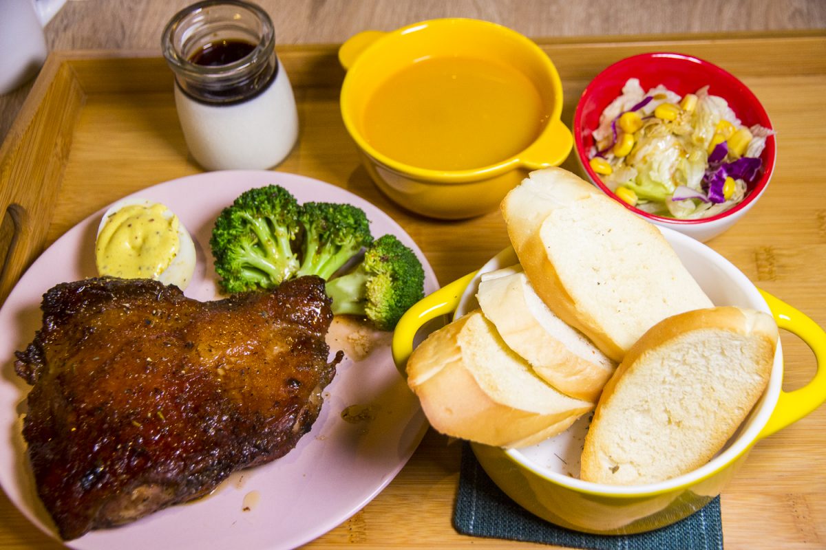 烤雞腿排的部份採用去骨雞腿,外皮烤得金黃帶點酥脆,
