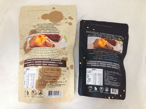 有分110克/包和60克/包 (60克/包主要是超商限定款哦!)大小不同口味一樣都是地瓜口味,外包裝圖樣也各有特色