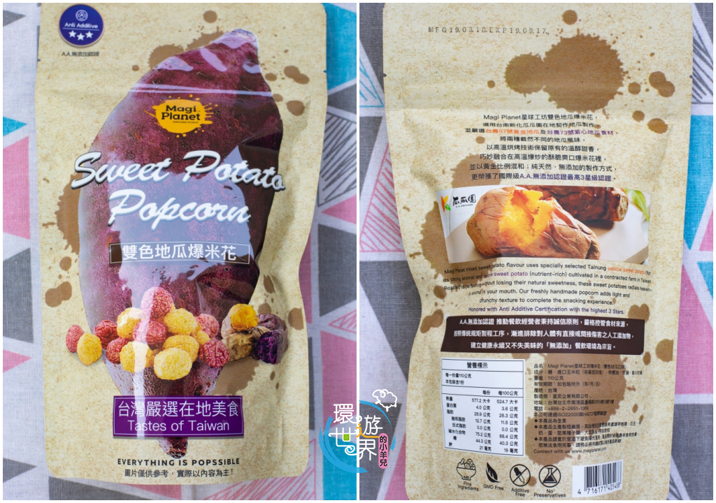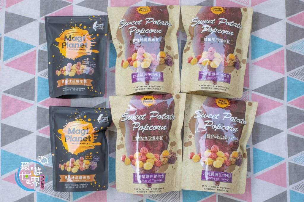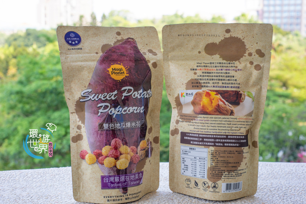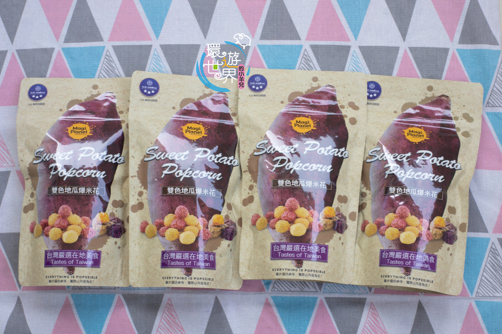 這次新推出的雙色地瓜爆米花,嚴選台農57號黃金地瓜及台農73號紫心地瓜食材,