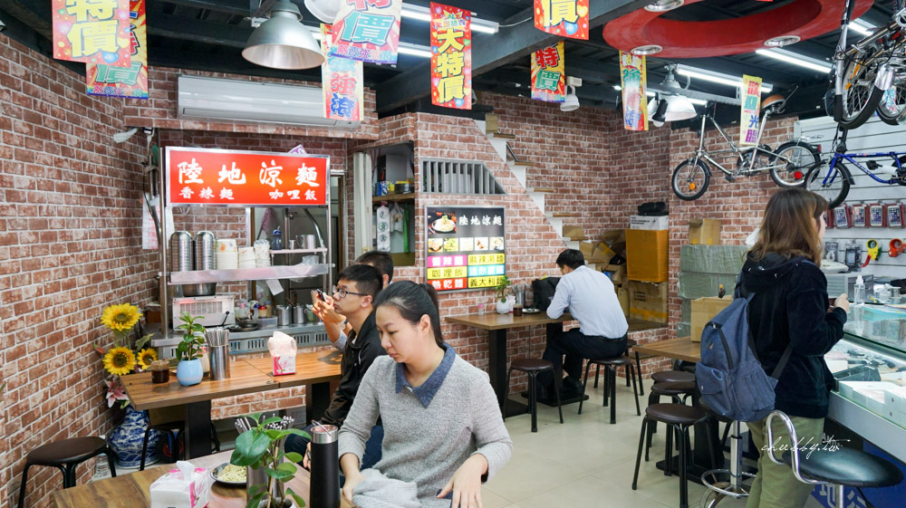 陸地涼麵內部真的是很特別的格局,一半是餐桌一半是手機維修及腳踏車店,天花板上的大特價會以為涼麵再打折,但其實不是。