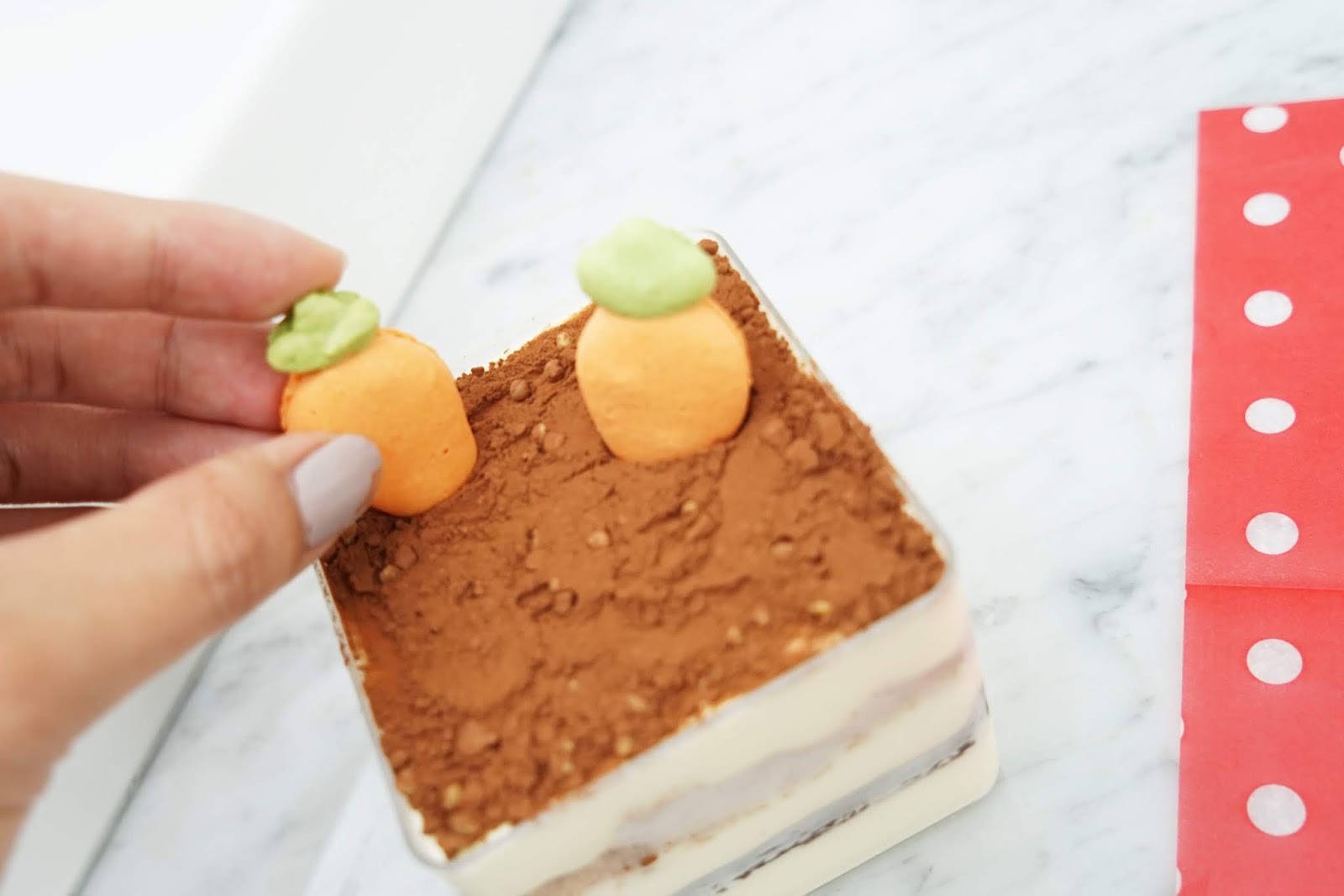 蛋糕主體、咖啡粉、紅蘿蔔形狀馬卡龍、鏟子湯匙、紅色點點也餐桌布