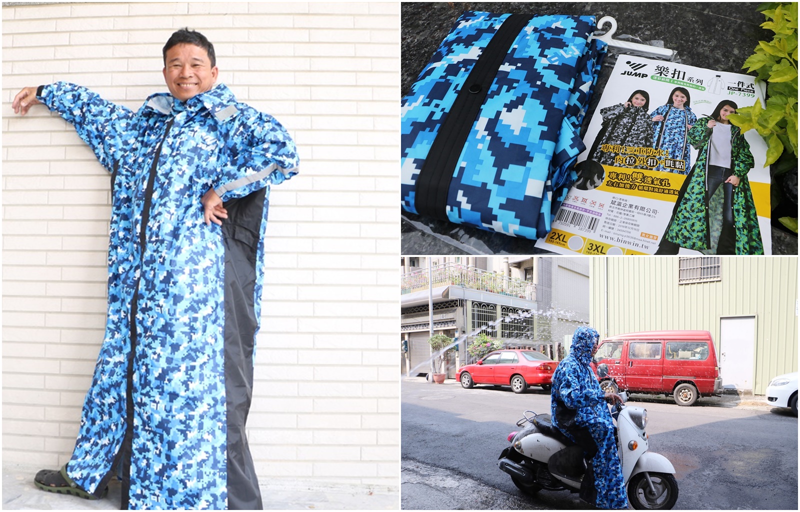 雨衣是每個家庭、機車族必備,特別是Hank拔平常在學校當導護,晚上夜市上班又晚歸,下雨時一件可防水、透氣、高係數反光無死角機能性雨衣更是不能少。JUMP將門 樂扣系列三重防水透氣-迷彩前開風雨衣是擁有多項獨家專利製作的雨衣,採用高標準耐水壓布料、數位迷彩設計印刷製作,不僅造型好看、防水防風,還有雙透氣孔專利設計,穿起雨衣有一股風回流,透氣不悶熱喔。