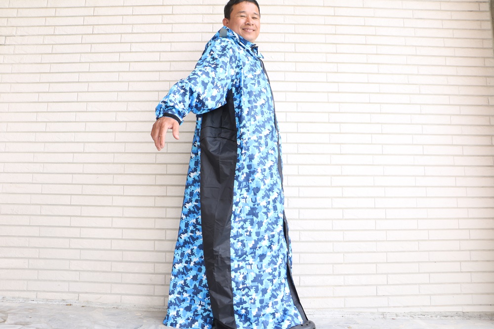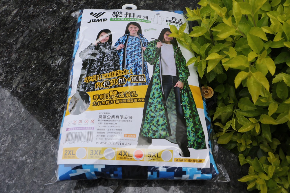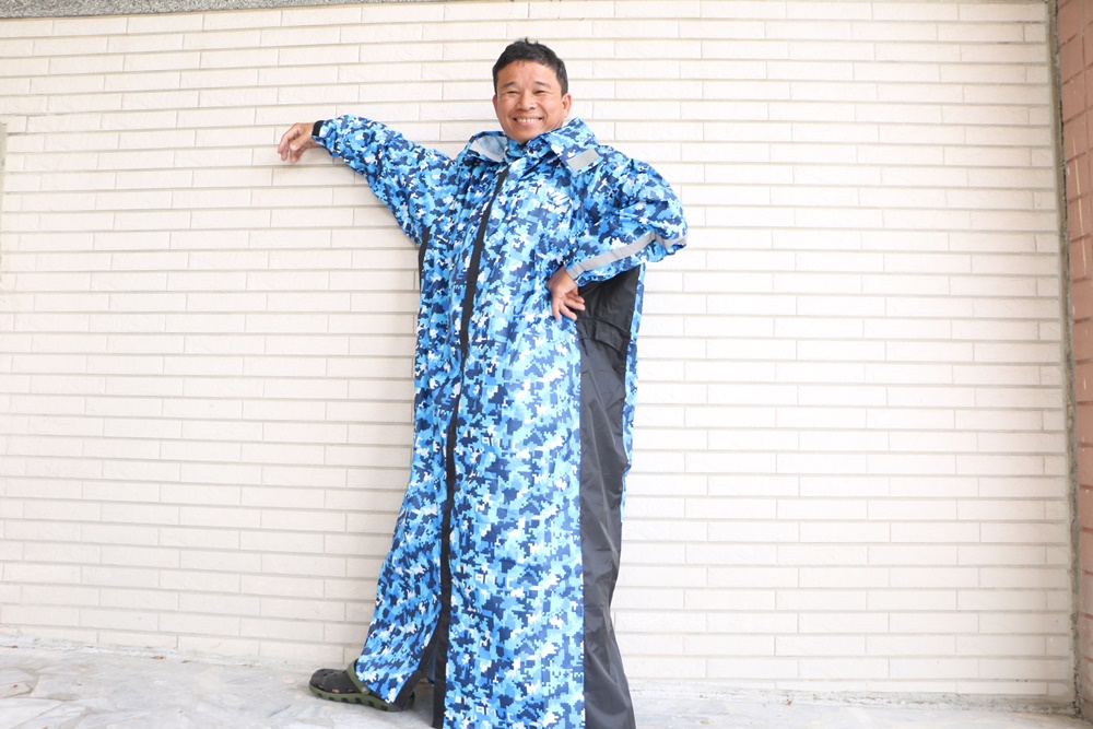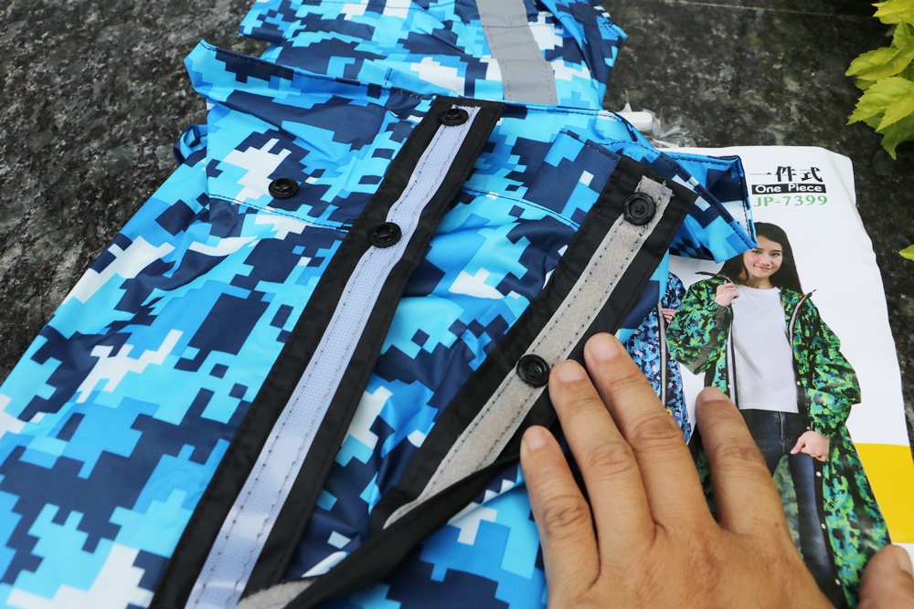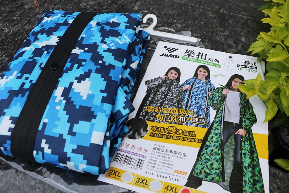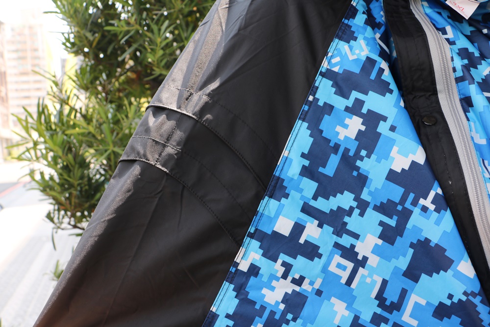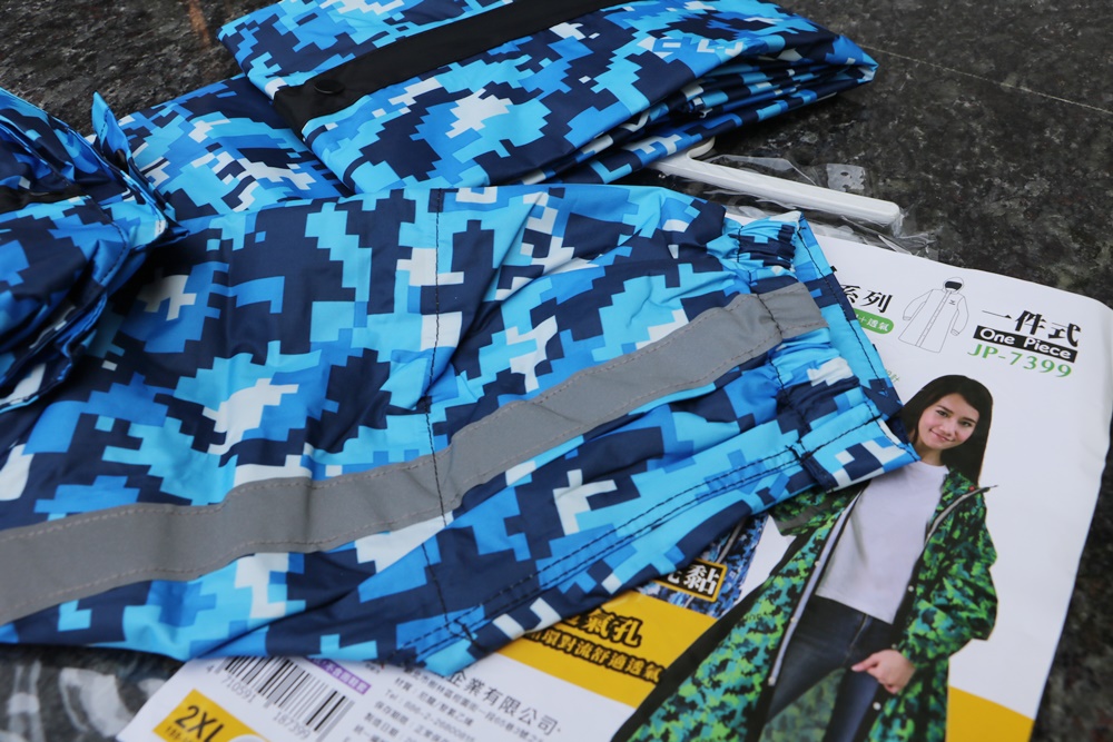 雨衣布料挑選也很用心,JUMP將門特別挑選高標準耐水壓布料製作,摸起來舒適厚實又有彈性,不是薄的那一種,而且沒有難聞的塑膠味。印刷也非一般市場常見的傳統迷彩,是使用數位迷彩設計印刷,色彩更為鮮艷亮麗,騎機車時遠遠一看很明顯喔。