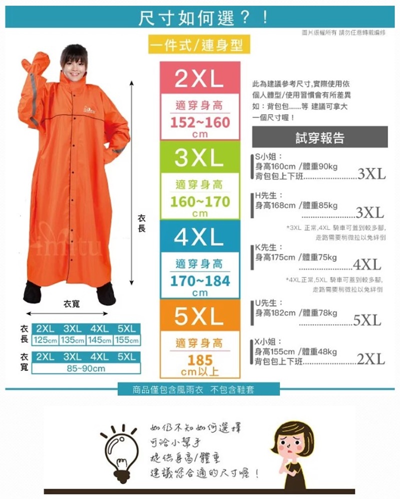 Hank拔身高165CM、體重70~75公斤,我為Hank拔挑選4XL。雨衣挑選不比平常穿衣顯瘦哲學,要比外套還要大一個size。有時候背背包,或是載小孩,都能一起安全躲在雨衣裡防風擋雨。