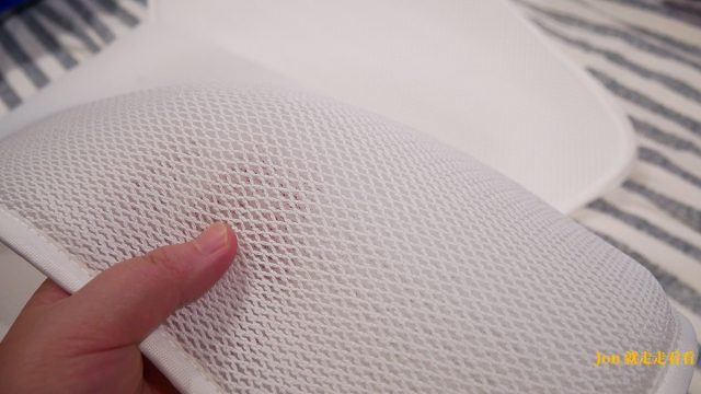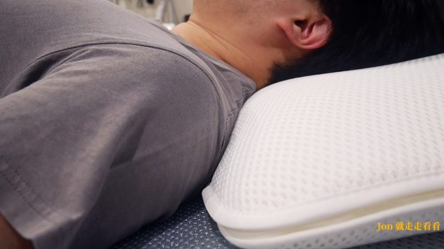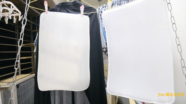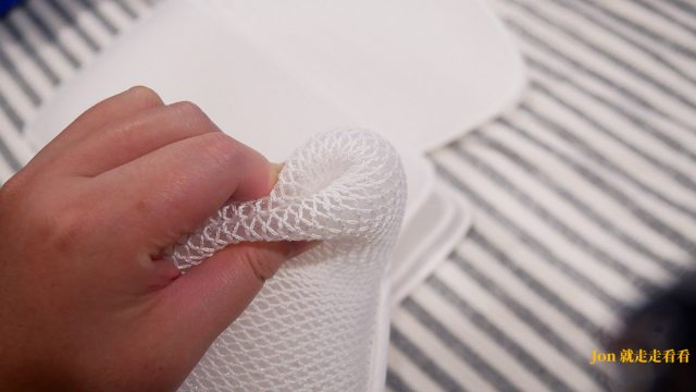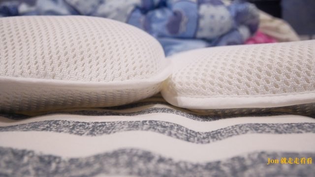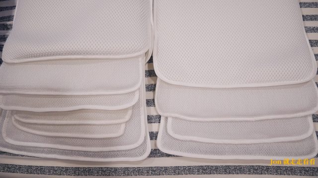 一顆枕頭裡面有六層透氣網布,Jon跟A先生有兩顆還可以互相搭配使用,Jon比較適合睡低枕,只用了3層網布,A先生的胸膛比較厚,需要睡比較高的枕頭,除了原來的六層網布之外還多加了Jon拆出來的一層,總共用了七層網布
