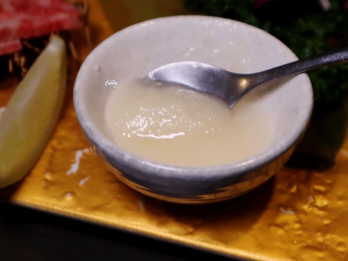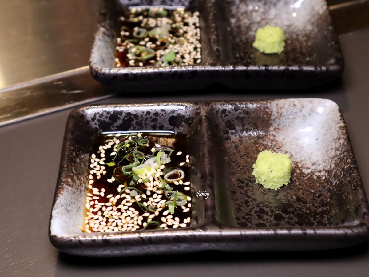 首先上了醬汁及芥末。這就是傳承百年的醬汁,製作工序需耗費極高的時間成本及人工成本。但一嚐之後醬汁的滋味深厚香醇,真的很棒喔!這都是可以依個人喜好,搭配和牛一起食用的。
