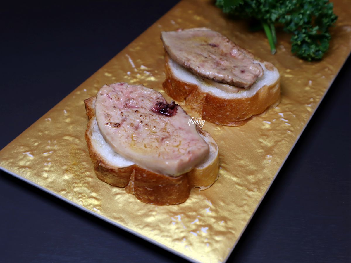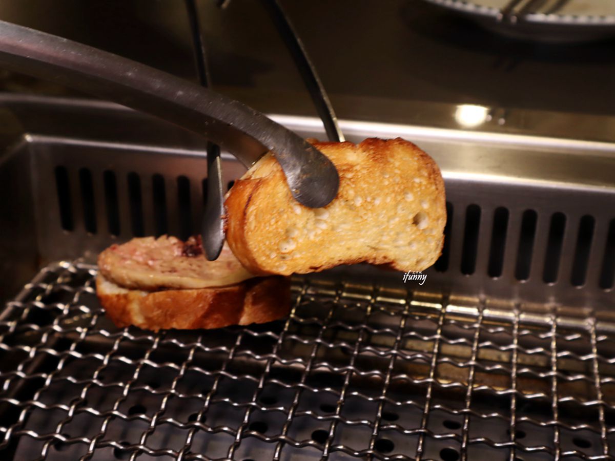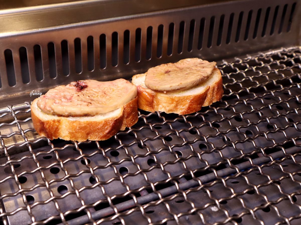 廚房已先將比利時的鵝肝稍炙燒過表面,然後放置在法國長棍切片上。