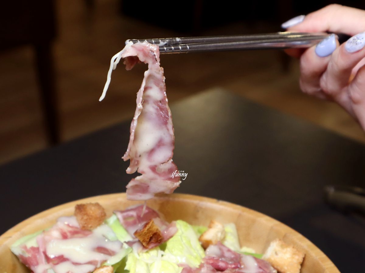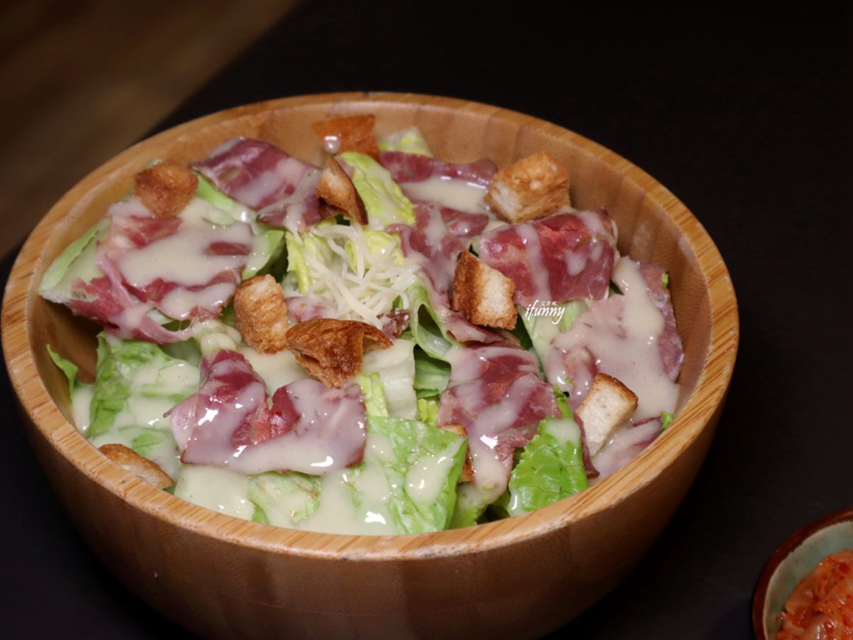 以和牛製成的風乾火腿,煙燻過鹹香的滋味很迷人,搭配凱薩沙拉來食用,在大口吃肉前補充個纖維質先。