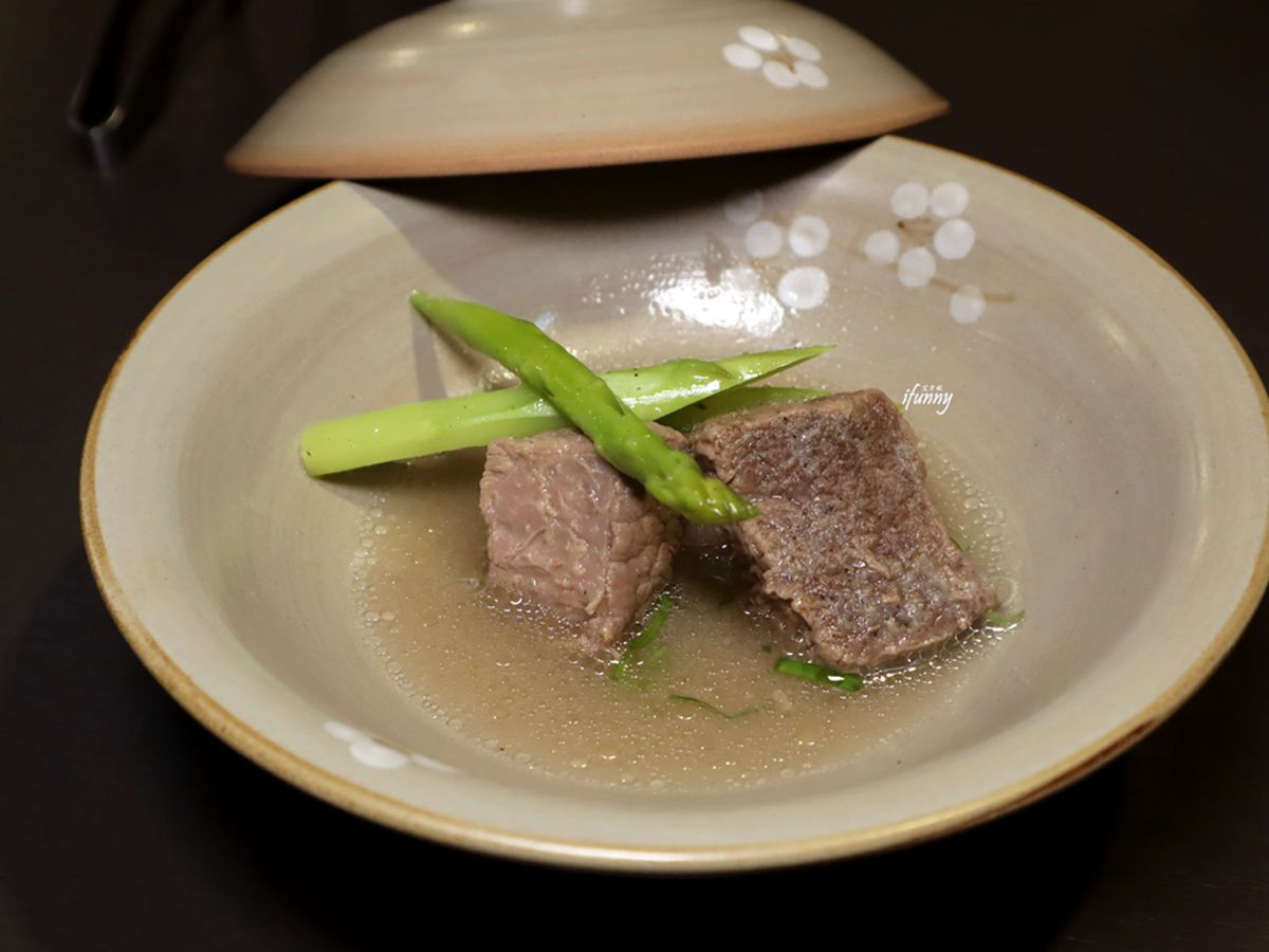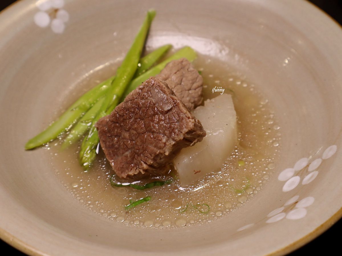 把青花筍、白蘿蔔及牛頸肉的滋味全燉在一起。看似清澈的湯汁,卻是味道很醇厚!尤其是深厚的昆布湯汁燉至食材之中,尤其是白蘿蔔軟嫩入味,美味意外地驚人!因為這並不是一道湯品,所以燉湯是集所有食材的滋味,味道是稍重一點的喔!