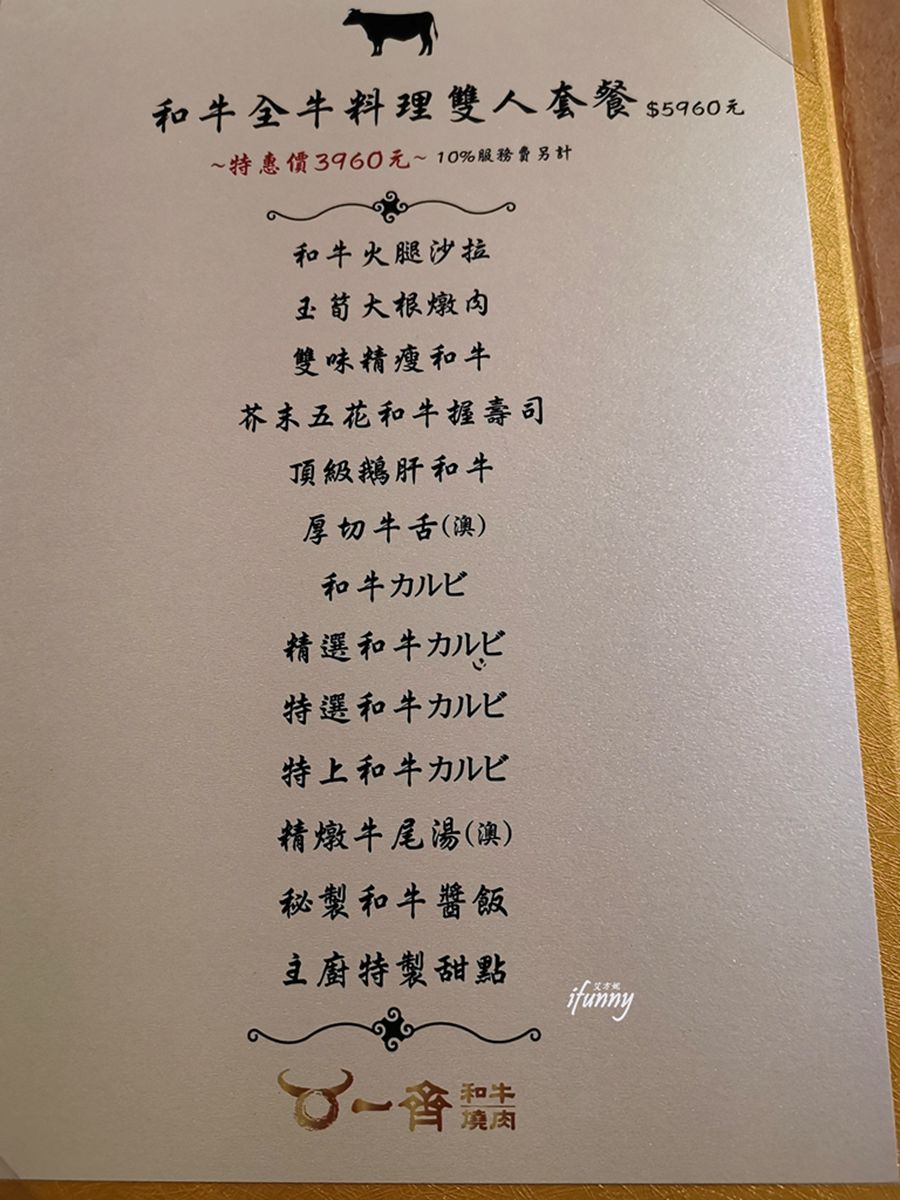 這天我們點的是這個和牛全牛料理雙人套餐 $3960+10%/特價,原價$5960。幾乎嚐到很多種部位,能以優惠價嚐到太幸運了!