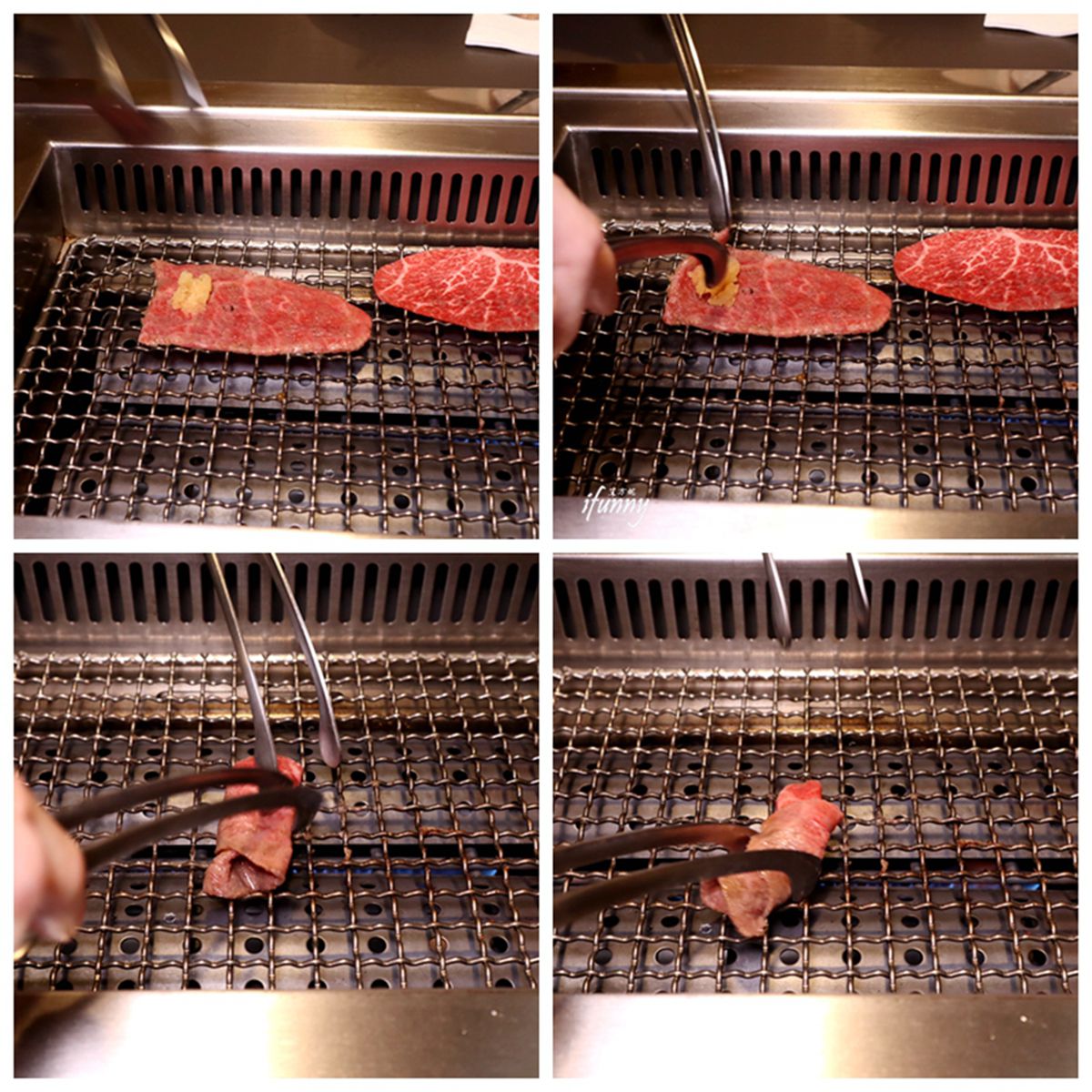 烤的肉片差不多時就會放入蘿蔔泥或蒜香奶油,然後再把肉片捲起來。