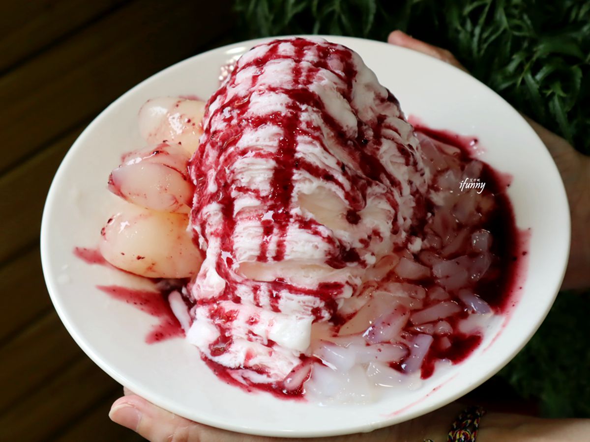 覓果榛品用的是荔枝冰磚所製作的雪花冰,其上加的是自製的莓果醬,彷彿就像是荔枝的外皮般。
