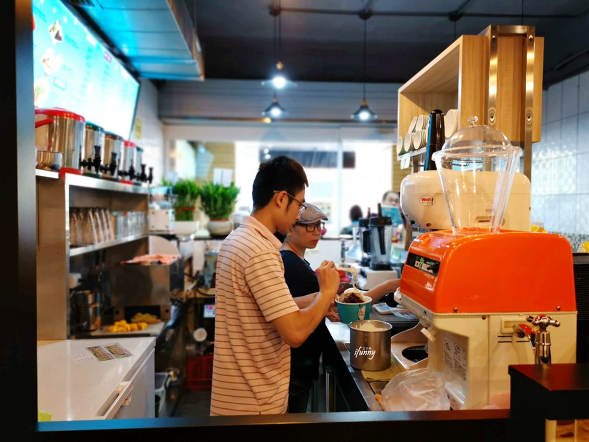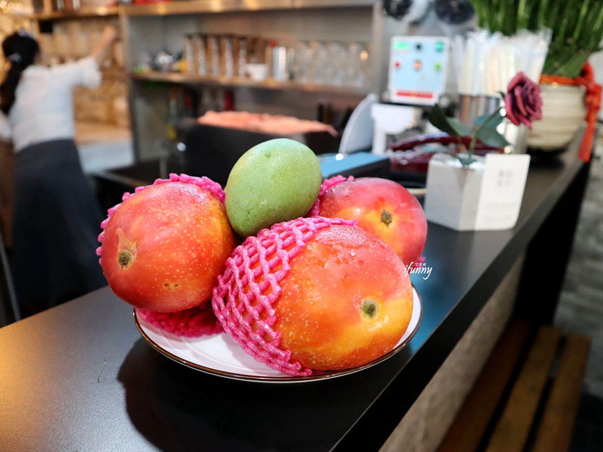 台灣是水果王國,當季的水果可說是又甜又好吃啊!現場客人點了芒果雪花冰,服務人員忙著削芒果。