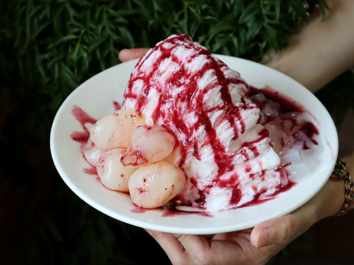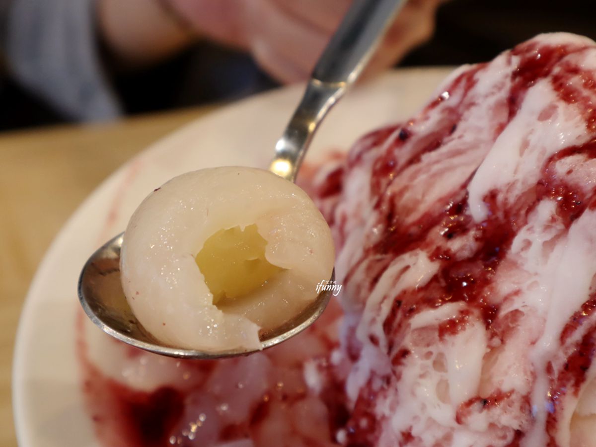 由於台灣的荔枝還沒到產季,於是暫時以泰國進口的龍鳳果替代,到了夏天就會是現剝的荔枝喔。雪花冰淡淡的荔枝清香,自製的莓果醬酸甜夠味,加上了椰果的顆粒感,整體吃來很有樂趣,而且味道很清爽,一個人吃上一碗都沒問題。
