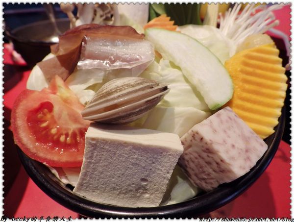 這是菜盤~有高麗菜、玉米黍、菜瓜、南瓜及胡蘿蔔等等,還有菇類及火鍋料及蛤蜊,而且蛤蜊還是活生生的喔!