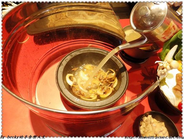 而我點的是拌炒石頭鍋—梅花豬肉(NTD260)~這個必須要先炒過,所以鍋中添加麻油及蒜頭,還有魷魚,炒到魷魚卷起後再加上洋蔥,等洋蔥炒出香味後,再加入豬肉炒半熟。
