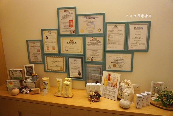 填問卷位置的對面牆上是執照牆,上面的執照有:孕婦執照、國際泌乳顧問、