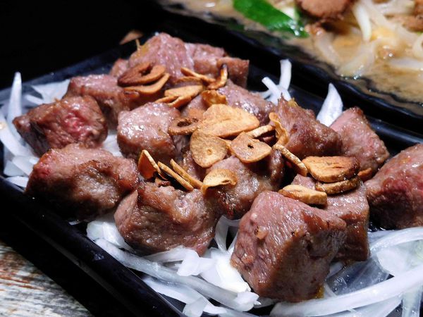 由整塊菲力切塊 ,慢火去烤鎖住肉汁 ,經由海鹽提出肉質的鮮甜 ,再撒上自製的蒜片
