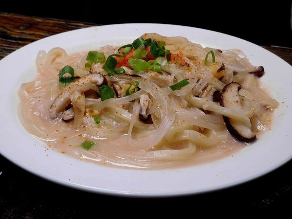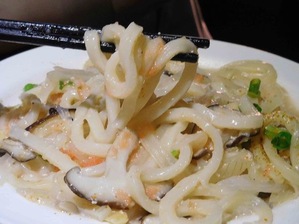 以奶油醬為底的明太子炒烏龍 ,搭配著明太子 ,烏龍麵QQ的口感 ,粗粗的麵體吸附著醬汁