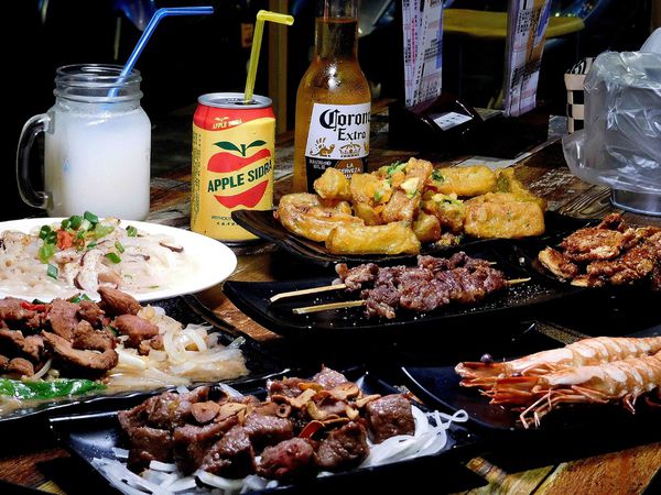 除了有大家想得到的串燒 烏龍麵 炒飯之外 ,還有熱炒 火鍋 手抓海鮮 烤羊腿 定食與便當