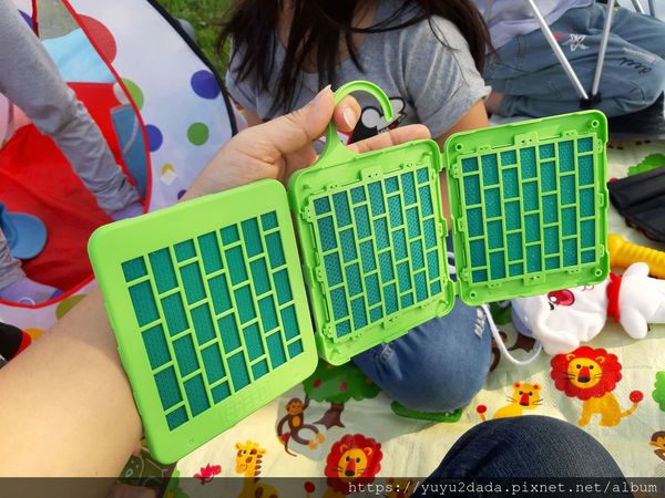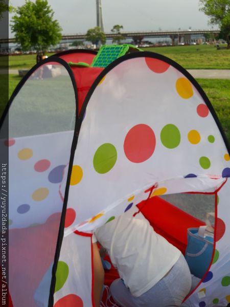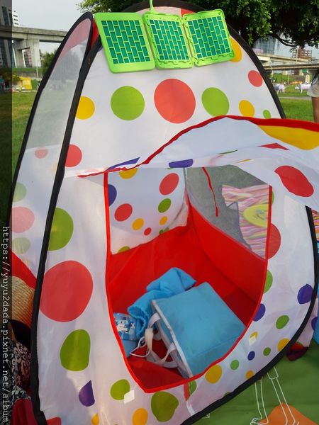 這天剛好要去戶外野餐~帶了一個小帳棚給小朋友玩~就把他放在帳棚上保護小孩吧~