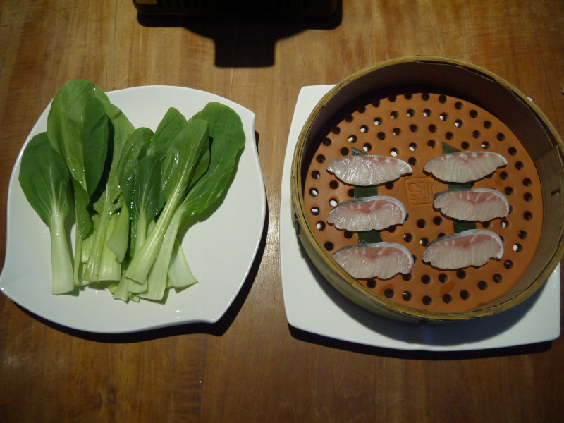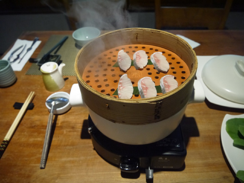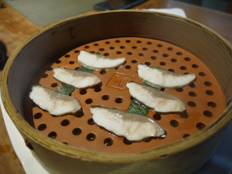 先將湯汁燒滾後再將有鱘龍魚片的蒸籠放上