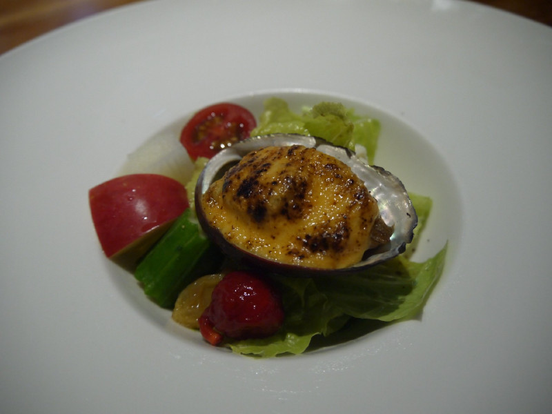 採用新鮮炙燒鮑魚搭配以臭氧水浸泡過的生菜及水果 可沾取主廚特調醬汁一起食用