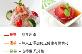 料理 : 以養生料理與創意懷石料理做為主軸. 選用台灣在地與當令新鮮食材進行烹調.