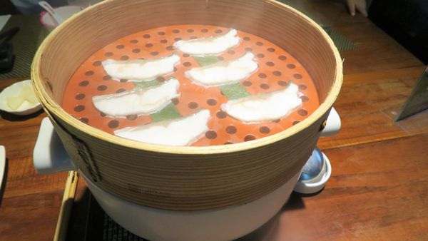 待湯汁燒滾後會再放上鱘龍魚去蒸.