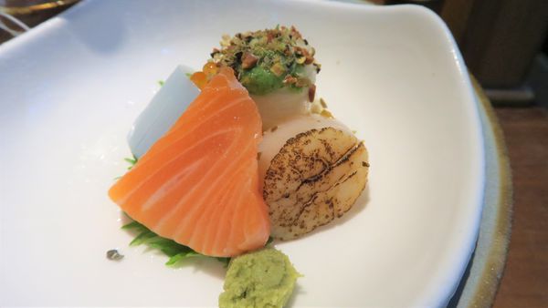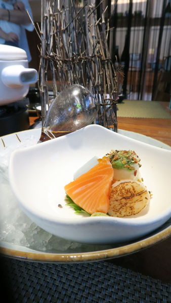 鮭魚刺身與炙燒生鮮干貝建議沾取一旁的現磨山葵一起食用.