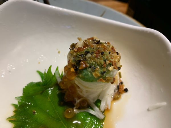 冰心上選刺身包含有山藥冷麵. 鮭魚刺身. 花枝卷以及炙燒生食級干貝