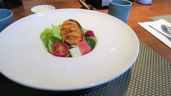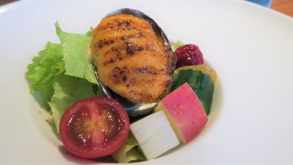 諾白的圓盤中心直放著黃橘色的炙燒鮑魚.