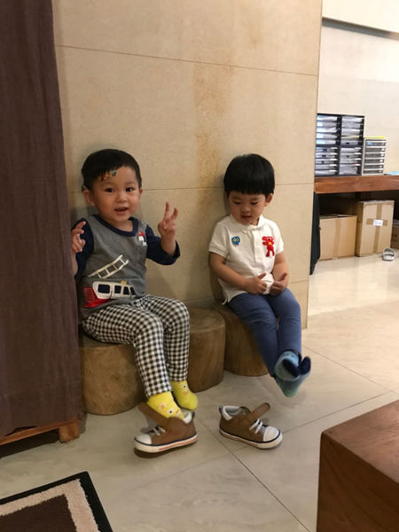 要離開時兩個小人十分開心在換鞋區跑來跑去大概是期待要去動物園跑