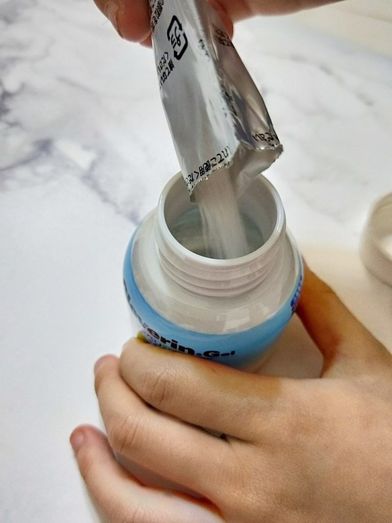 緩釋凝膠使用方法 請將白色瓶蓋打開,將內附鋁箔袋中之粉劑倒入瓶中,靜置約15分鐘