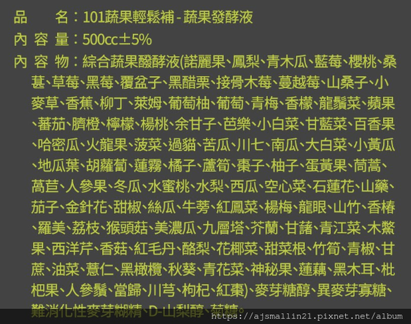 官方介紹:【101蔬果輕鬆補-蔬果發酵液】特選台灣101種蔬果精華,以專利技術發酵,低糖、高纖、加強藍紫色蔬果營養、零雜菌汙染、口口蔬果營養素,幫助排便順暢和調整體質,每批均自主送SGS檢驗,符合安全要求,榮獲國內外四項認證,適合外食/挑食/攝取不均/注重養顏美容...等族群引用。
