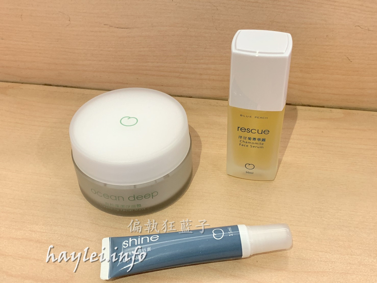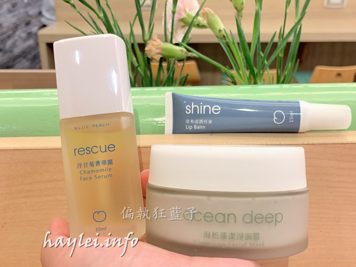 我手邊的BLUE PEACH基礎肌膚保養品有洋甘菊菁華露rescue、海松藻潔淨面膜ocean跟透明滋潤唇蜜trio等,從清潔、舒緩到滋潤等都一應俱全^^