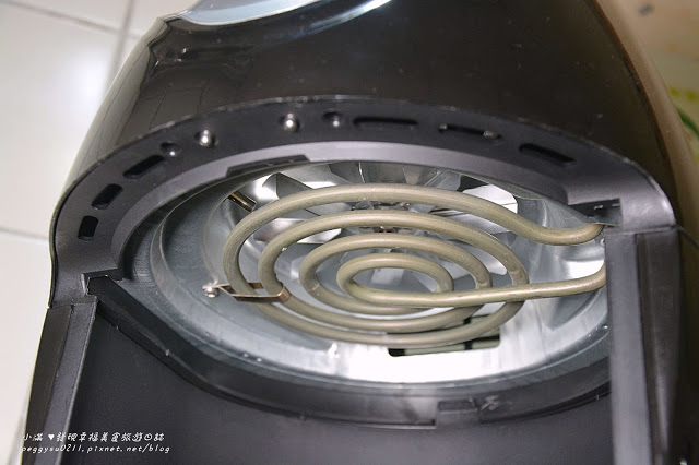 很像蚊香的加熱管會快速升溫,搭配九片風扇葉片,快速將熱空氣往鍋內吹送