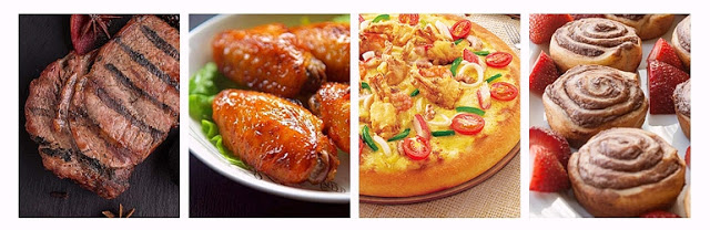 從左到右包含薯條、豬肉、蝦子、蛋糕、雞腿、牛排、烤魚