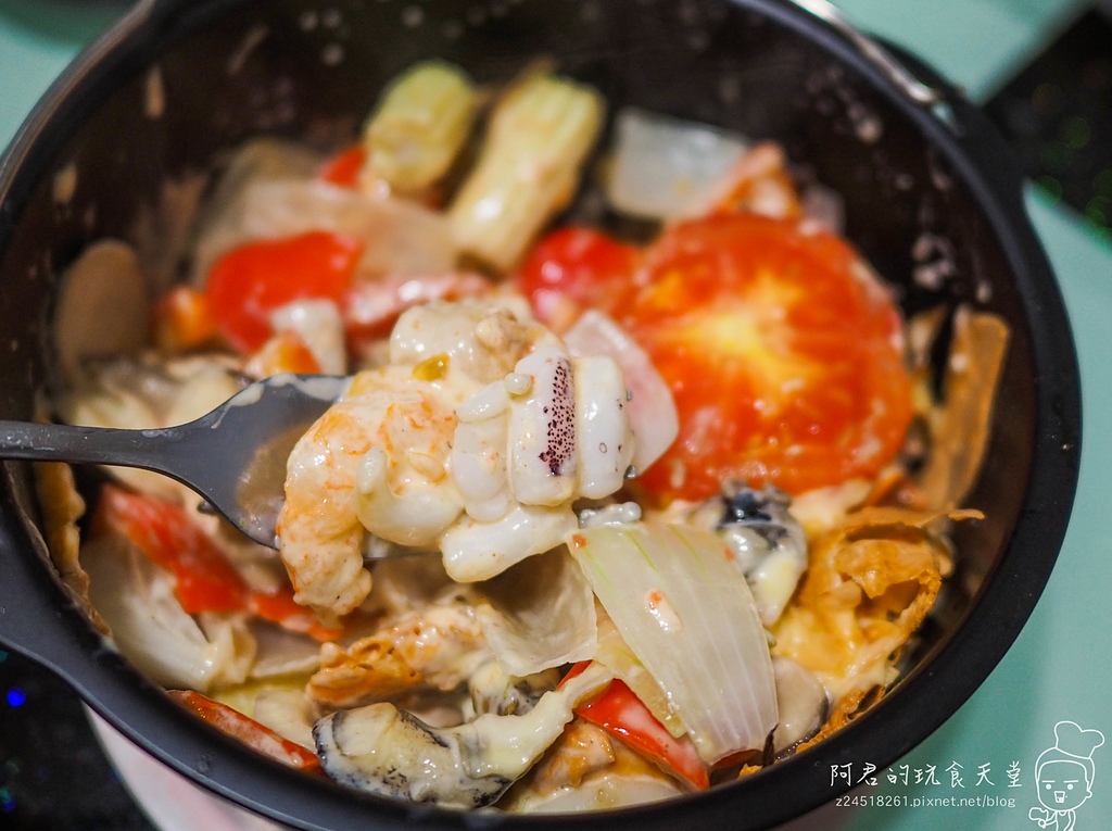 6. 焗烤海鮮(調整160度,15分),海鮮洗過之後,簡單快炒過,然後就可以放入內膽中,上面鋪上番茄、起司就可以烤囉。