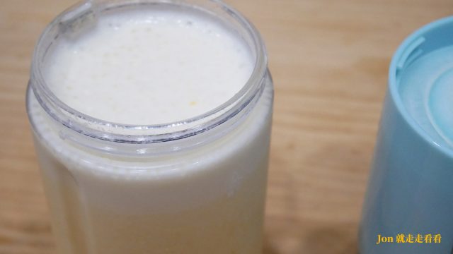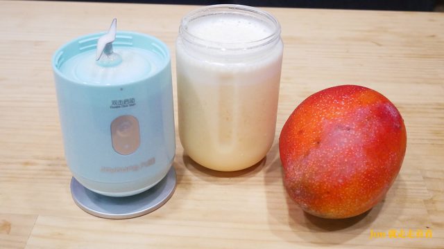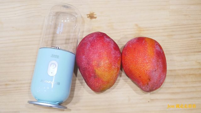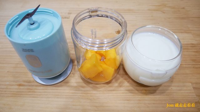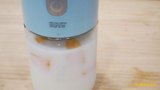 【JOYOUNG 九陽 隨身果汁機 JYL-C902D】的果汁杯容量是300ml,可以放得下一整個芒果的果容,這次Jon用半顆芒果,再加入牛奶