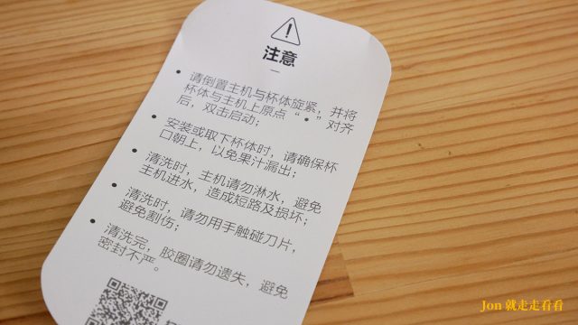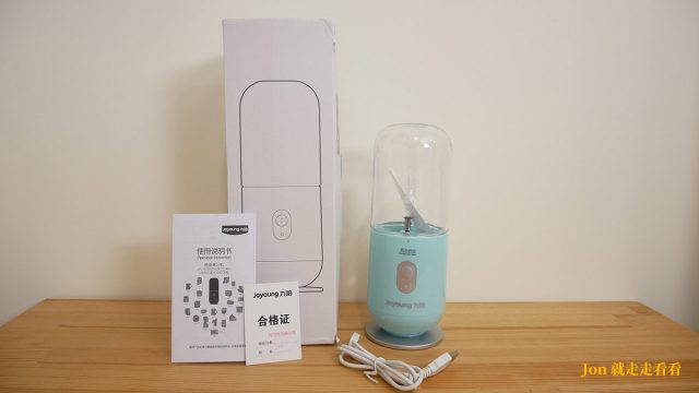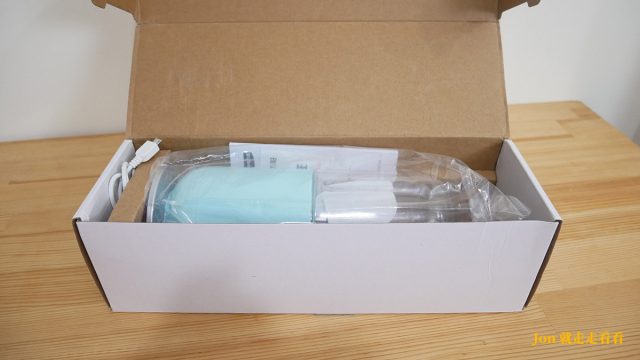 盒內配件一打開就看完了,果汁機、說明書、保證書、充電線,都不用組裝超方便,Jon最不會組裝了,每次都弄好久…