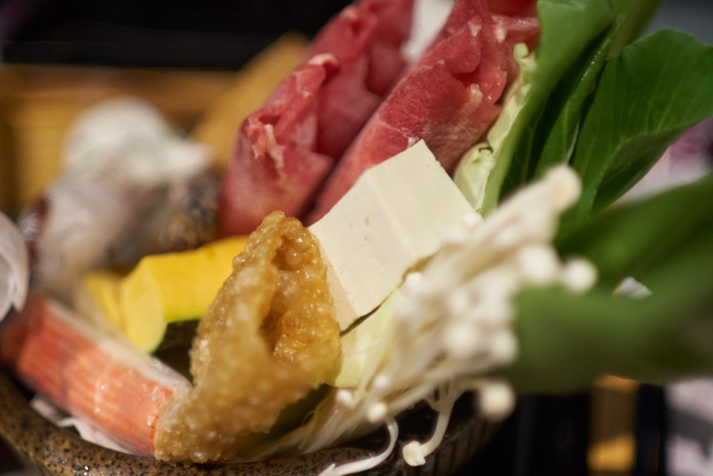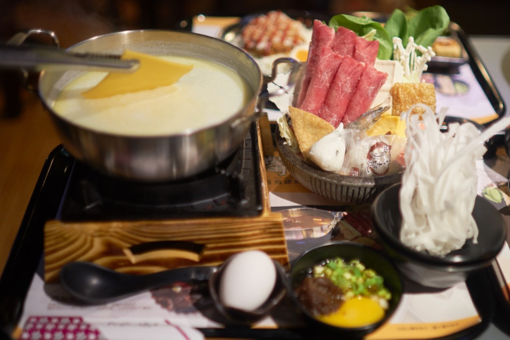 整份鍋物包含肉品、菜盤和生蛋,副食有白飯或寬冬粉可選,