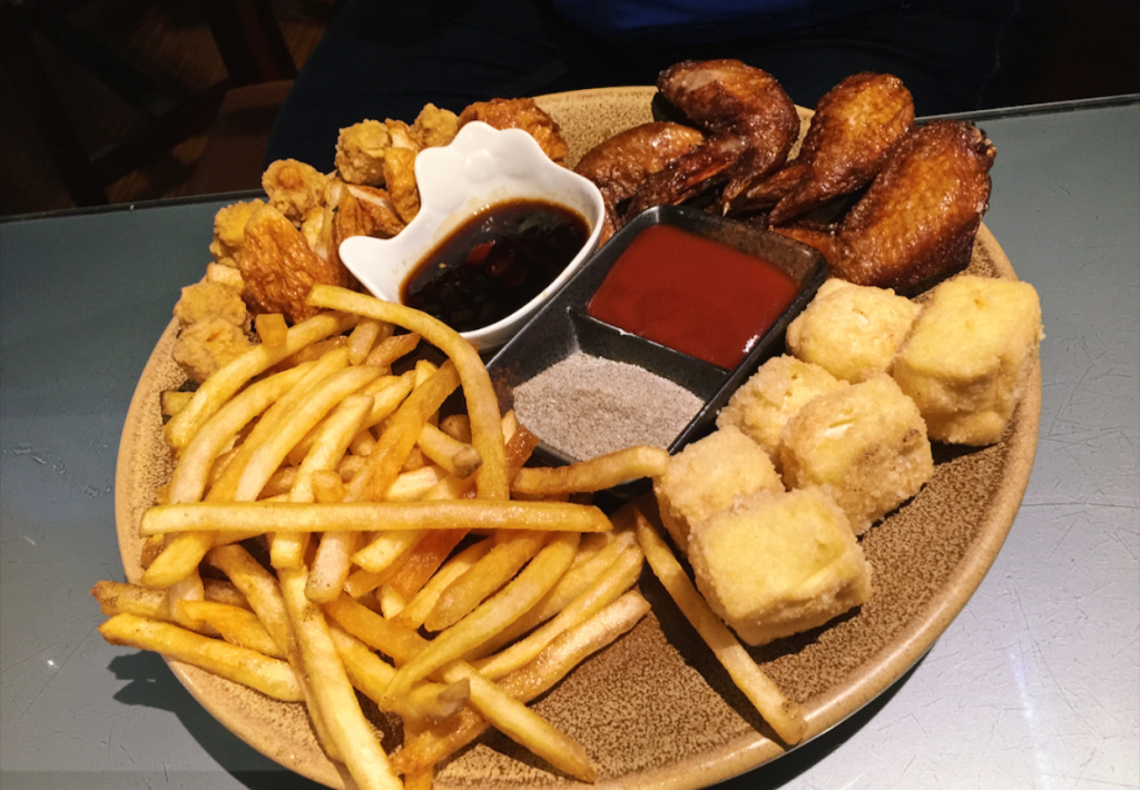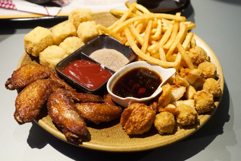 這美式大拼盤份量超多,裡面有炸薯條、花枝丸、炸豆腐、雞米花跟炸雞翅。