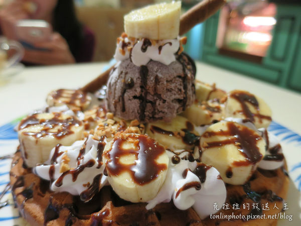 格子鬆餅上除了有滿滿的香蕉、巧克力醬、鮮奶油之外,