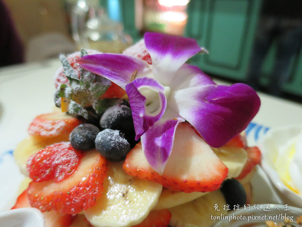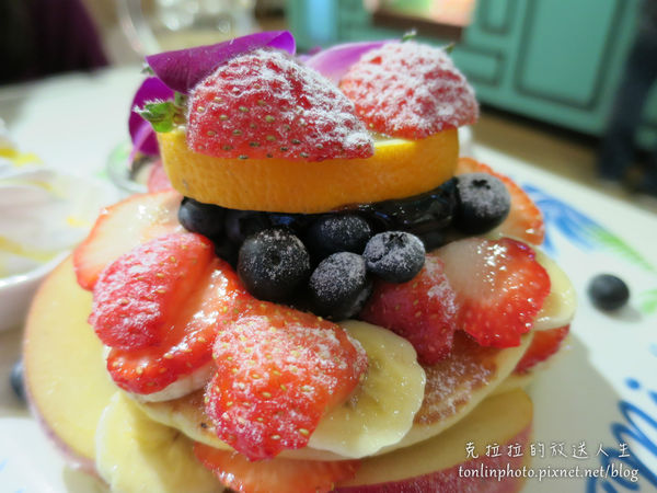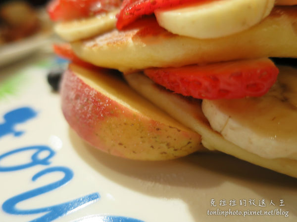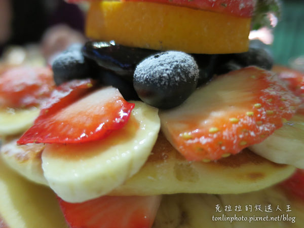 兩層 Pancake 上疊上了滿滿的草莓、香蕉、藍莓、蘋果、還有柳丁!