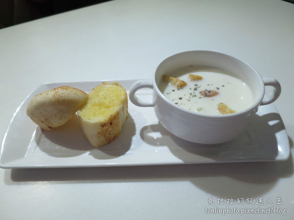 因為朋友點的主餐有加點149元的套餐,所以先上的是主廚特調濃湯和法式起司麵包。