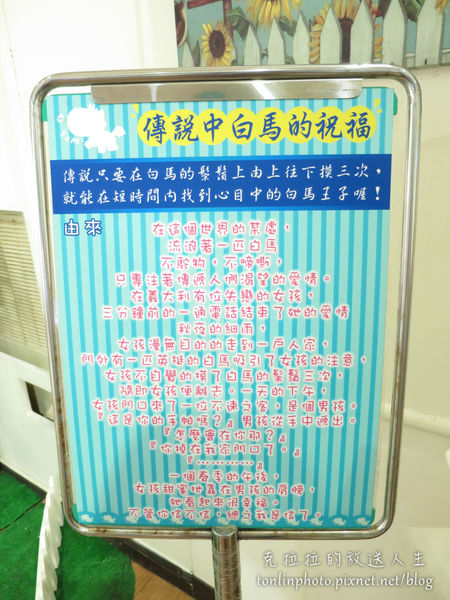 旁邊的說明有寫:傳說只要由上往下摸三次白馬的鬃鬚,就會在短時間找到心目中的白馬王子喔!