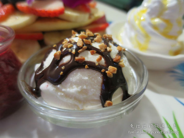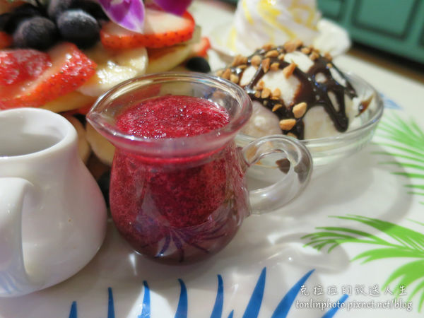 除了附上一球香草冰淇淋之外,還附上了非常充足的鮮奶油、莓果醬、楓糖漿。