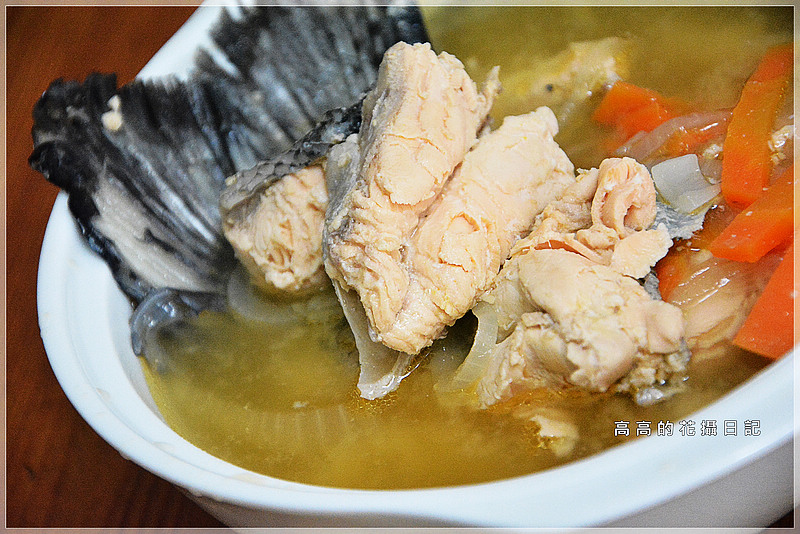 等到洋蔥、紅蘿蔔都煮到熟軟之後,再將切塊鮭魚丟入鍋中,
